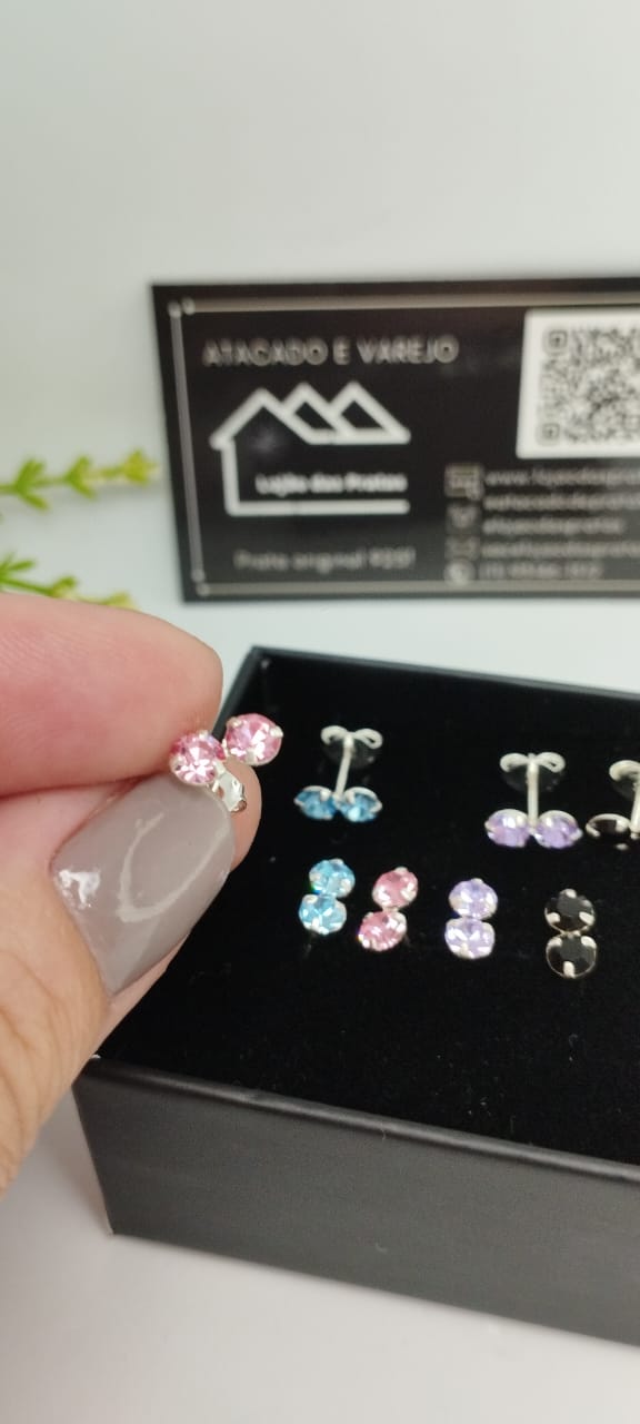 O brinco contém uma base única com duas pedras, proporcionando uma impessão de furo duplo.