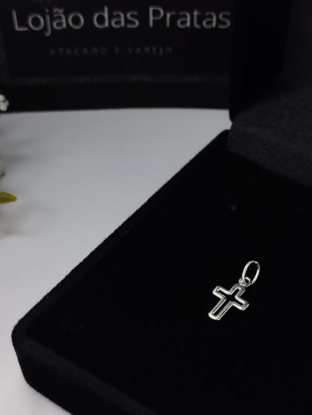 Pingente no formato Cruz vazada, cortado a laser proporcionando exclusividade a peça.
