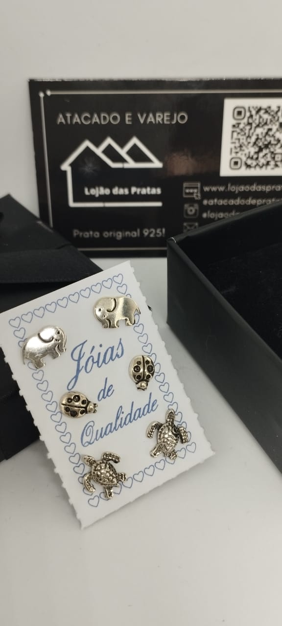 Trio de brincos bichos Elefante, Joaninha e Tartaruga em prata 925